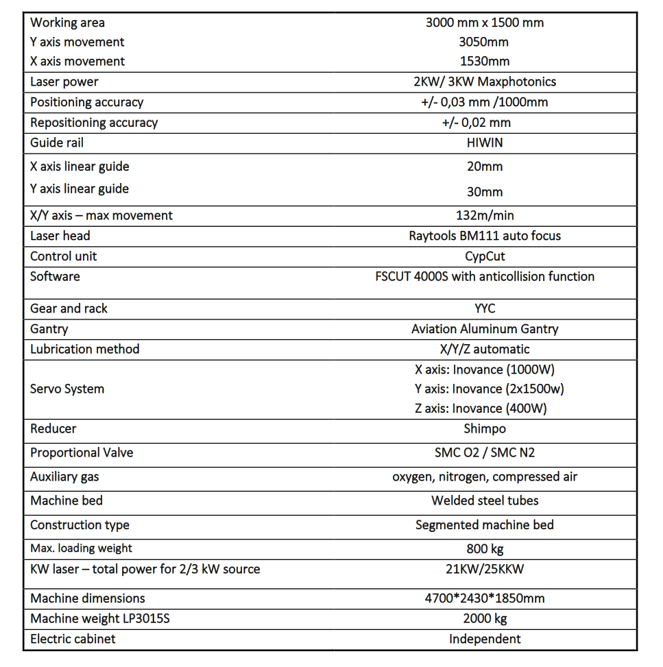 Radno područje - 3000 mm x 1500 mm, 6300 mm; Dimenzije stroja LP3015ST17 - 8466 x 3689 x 2190 mm, 3, 8 T; Snaga izvora - 3000W; Maks. ubrzanje - 1.5 G; Laserska glava - Raytools BM111 auto focus; Laserski izvor - Maxphotonics; Upravljačka jedinica - CypCut; Sofver - FSCUT 3000DE-M; Servo motori - Panasonic; Dužina cijevi - 6000 mm; Promjer cijevi - 10 mm - 120 mm; Kvadratne cijevi - 10 x 10 mm - 120 x 120 mm; Maks. težina cijevi - 120 kg; Rezni plinovi - kisik, dušik, komprimirani zrak; Tip konstrukcije - segmentirani stol s odzračivanjem; Ukupna potrebna instalirana el. energija za 3 KW laser - 28 KW