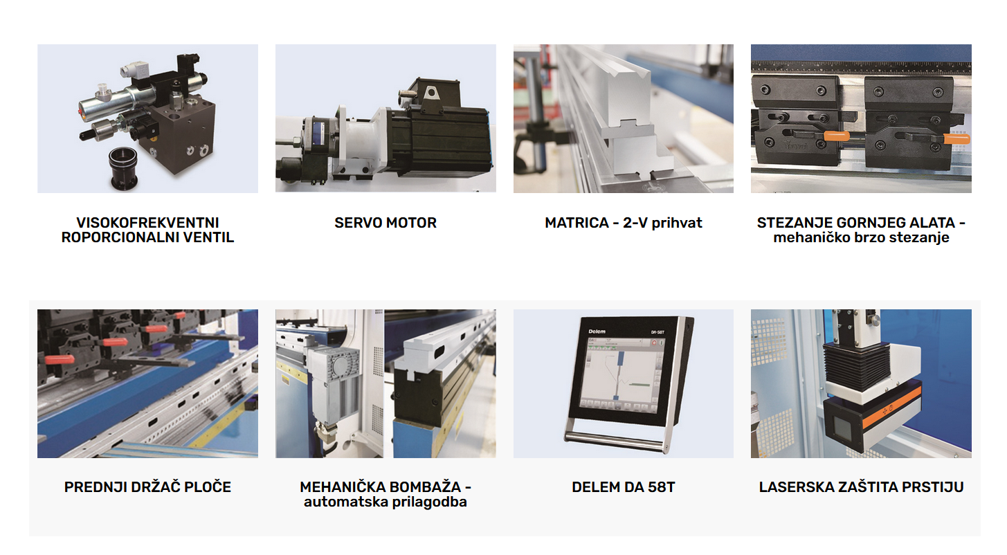 Velika preciznost i efikasnost kod savijanja najrazličitijih materijala. Automatska kontrola temperature ulja produljuje vijek trajajanja cilindara, a time i životni vijek stroja. Automatska mehanička bombaža, optimizirani parametri i konfiguracija omogućuju jednostavno upravljanje i fleksibilnost.